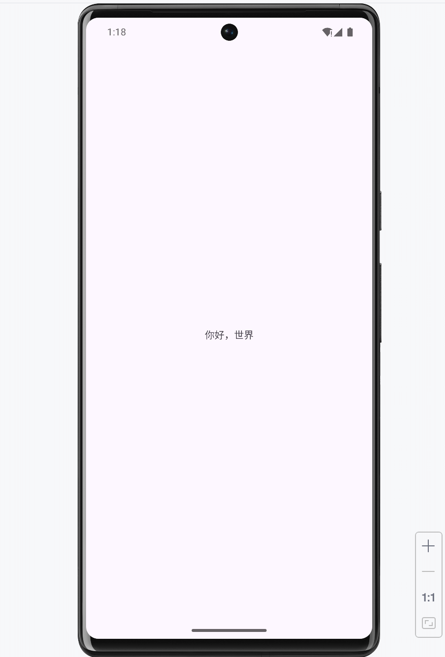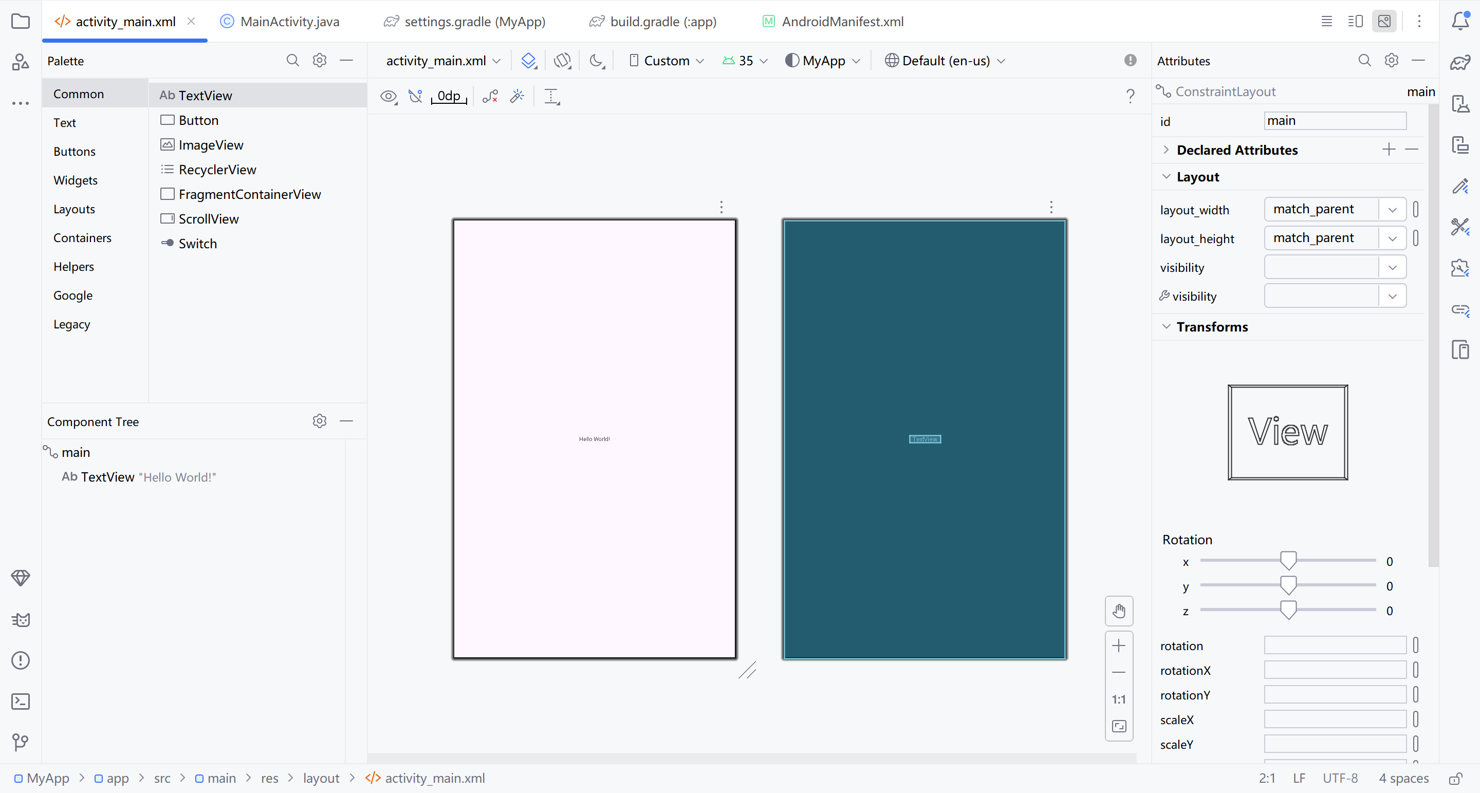 - 使用 XML 文件描述 App 界面,可以很方便地在 Android Studio 上预览界面效果。比如新创建的 App 项目,默认首页布局为 activity_main.xml,单击界面右上角的 Design 按钮,即可看到如图 2-15 所示的预览界面。