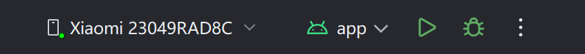 经过以上步骤,总算具备通过电脑在手机上安装 App 的条件了。马上启动 Android Studio,在顶部中央的执行区域看到已连接的手机信息,如图 2-3 所示。此时的设备信息提示这是一台小米手机,单击手机名 称右边的三角运行按钮,接下来就是等待 Android Studio 往手机上安装 App 了。
