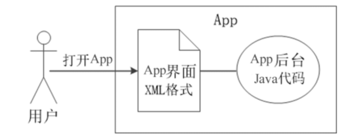 手机的功能越来越强大,某种意义上相当于微型电脑,比如打开一个电商 App,仿佛是在电脑上浏览网站。网站分为用户看得到的网页,以及用户看不到的 Web 后台;App 也分为用户看得到的界面,以及用户看不到的 App 后台。虽然 Android 允许使用 Java 代码描绘界面,但不提倡这么做,推荐的做法是将界面设计从 Java 代码剥离出来,通过单独的 XML 文件定义界面布局,就像网站使用 HTML 文件定义网页那样。直观地看,网站的前后端分离设计如图 2-13 所示,App 的前后端分离设计如图 2-14 所示。