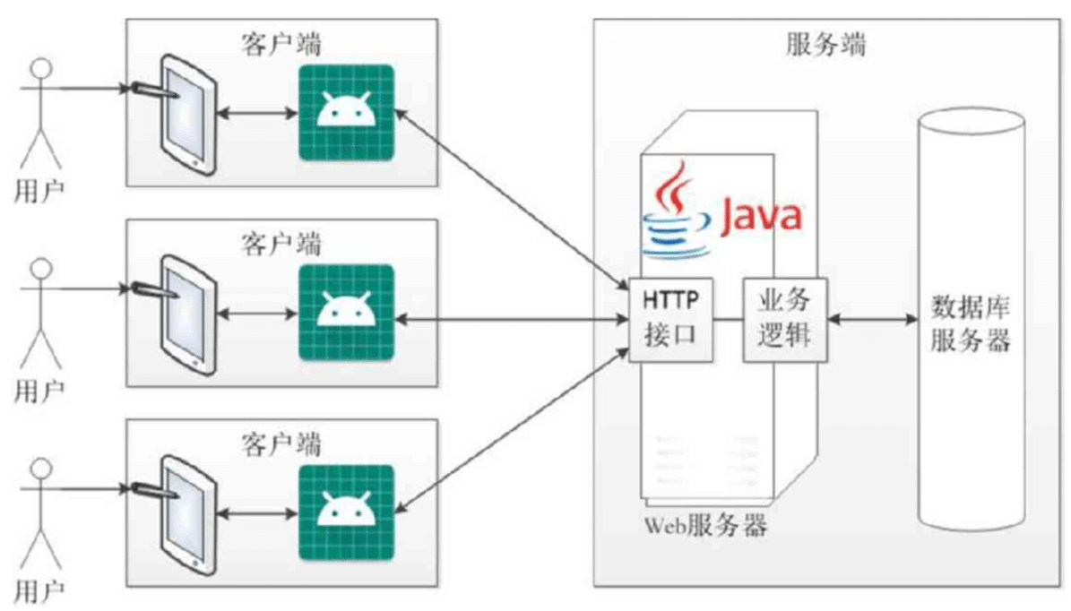 由此看来,一个具备用户管理功能的 App 系统,实际上并不单单只是手机上的一个应用,还包括与其对应的 Java Web 服务。手机里的客户端 App,面向的是手机用户,App 与用户之间通过手机屏幕交互;而后端的服务程序,面向的是手机 App,客户端与服务端之间通过 HTTP 接口交互。客户端和服务端这种多对一的架构关系如图 2-11 所示。