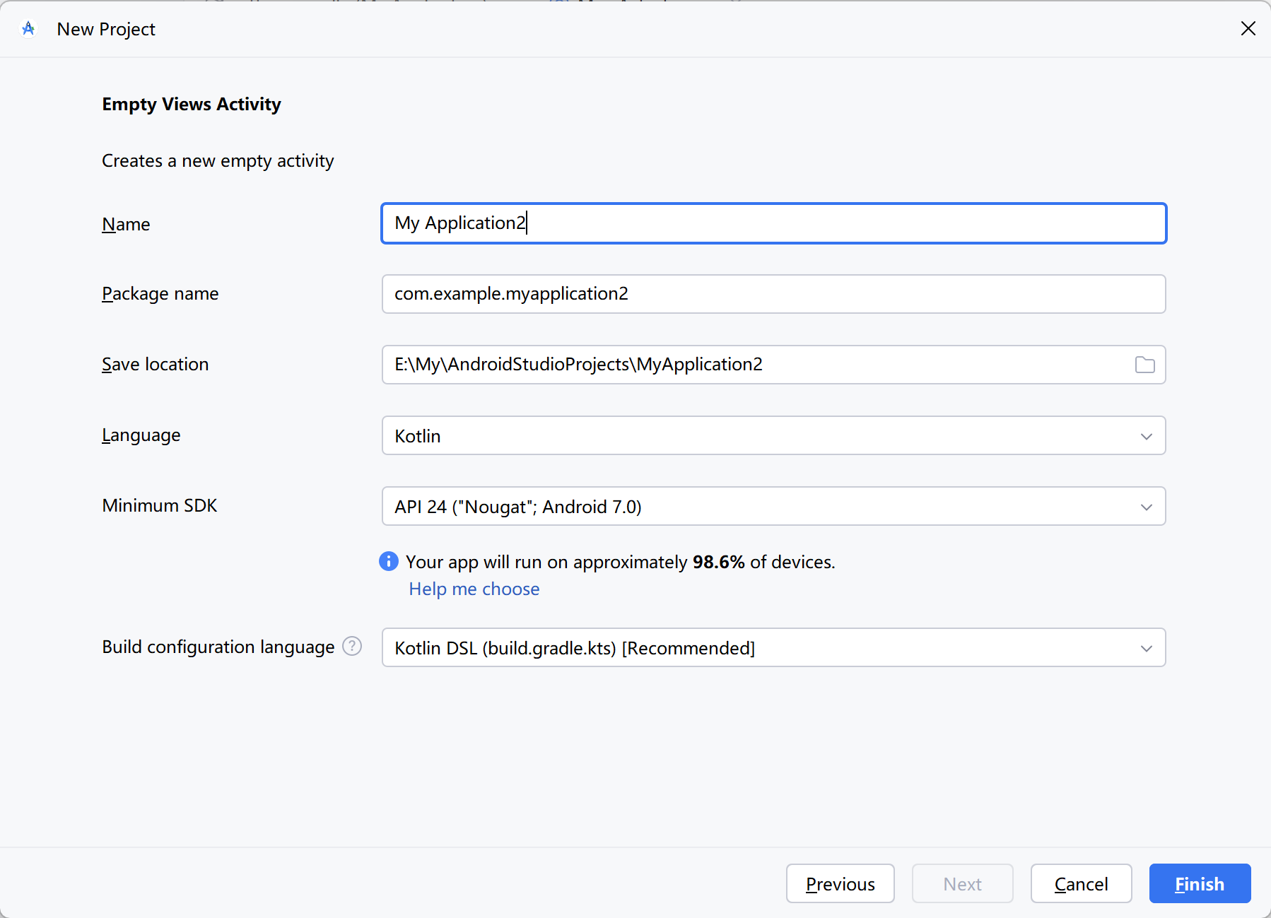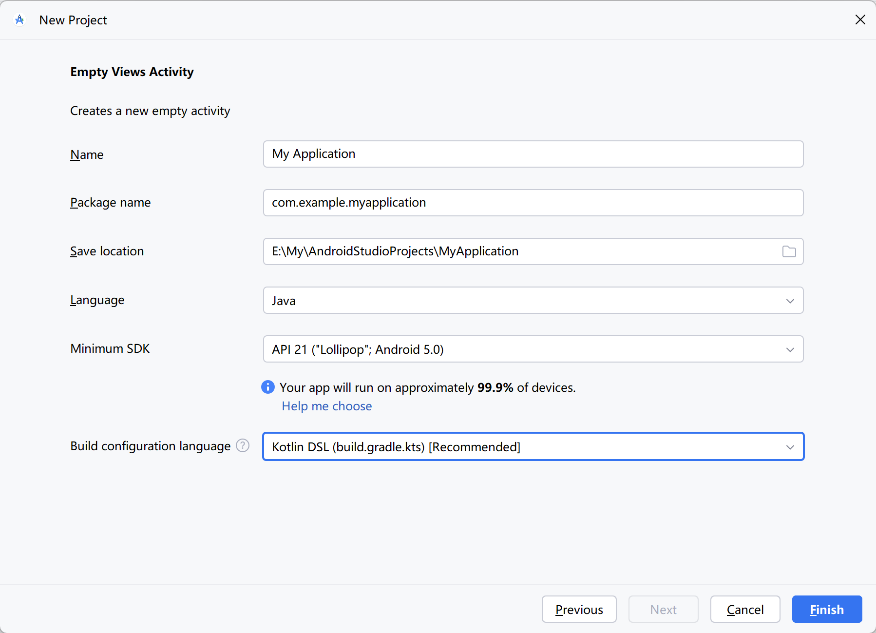 Java 是 Android 开发的主要编程语言,在创建新项目时,弹出如图 2-4 所示的项目配置对话框,看见 Language 栏默认选择了 Java,表示该项目采用 Java 编码。