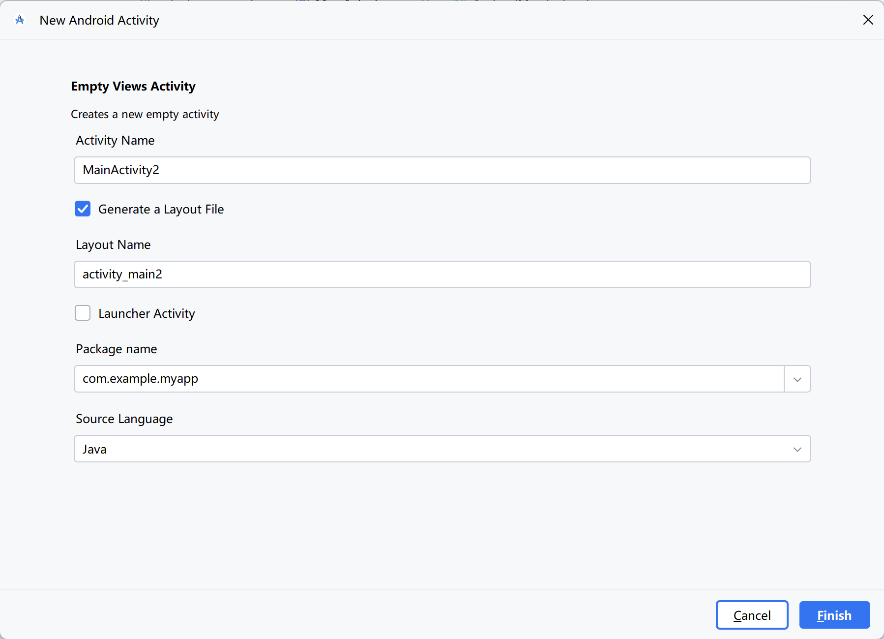 在页面创建对话框的 Activity Name 输入框中填写页面的 Java 类名(例如 Main2Activity),此时下方的 Layout Name 输入框会自动填写对应的 XML 文件名(例如 activity_main2),单击对话框右下角的 Finish 按钮,完成新页面的创建动作。