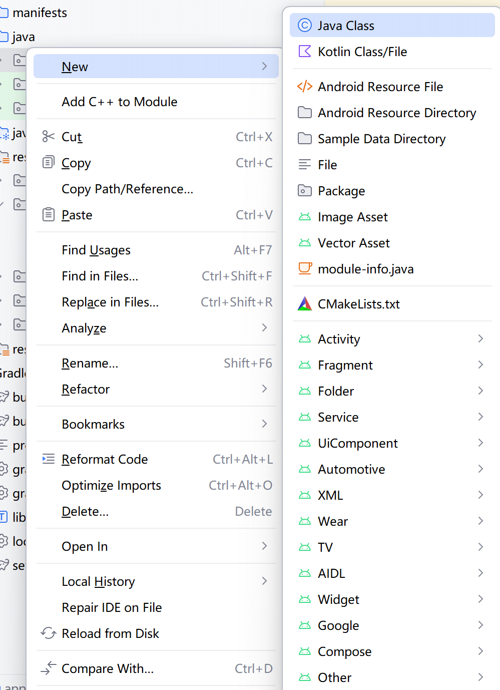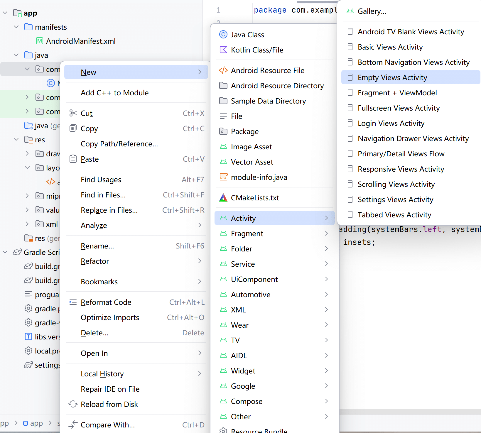 同样在 Android Studio 左上方找到项目结构图,右击 Java 目录下面的包名,弹出如图 2-22 所示的右键菜单。