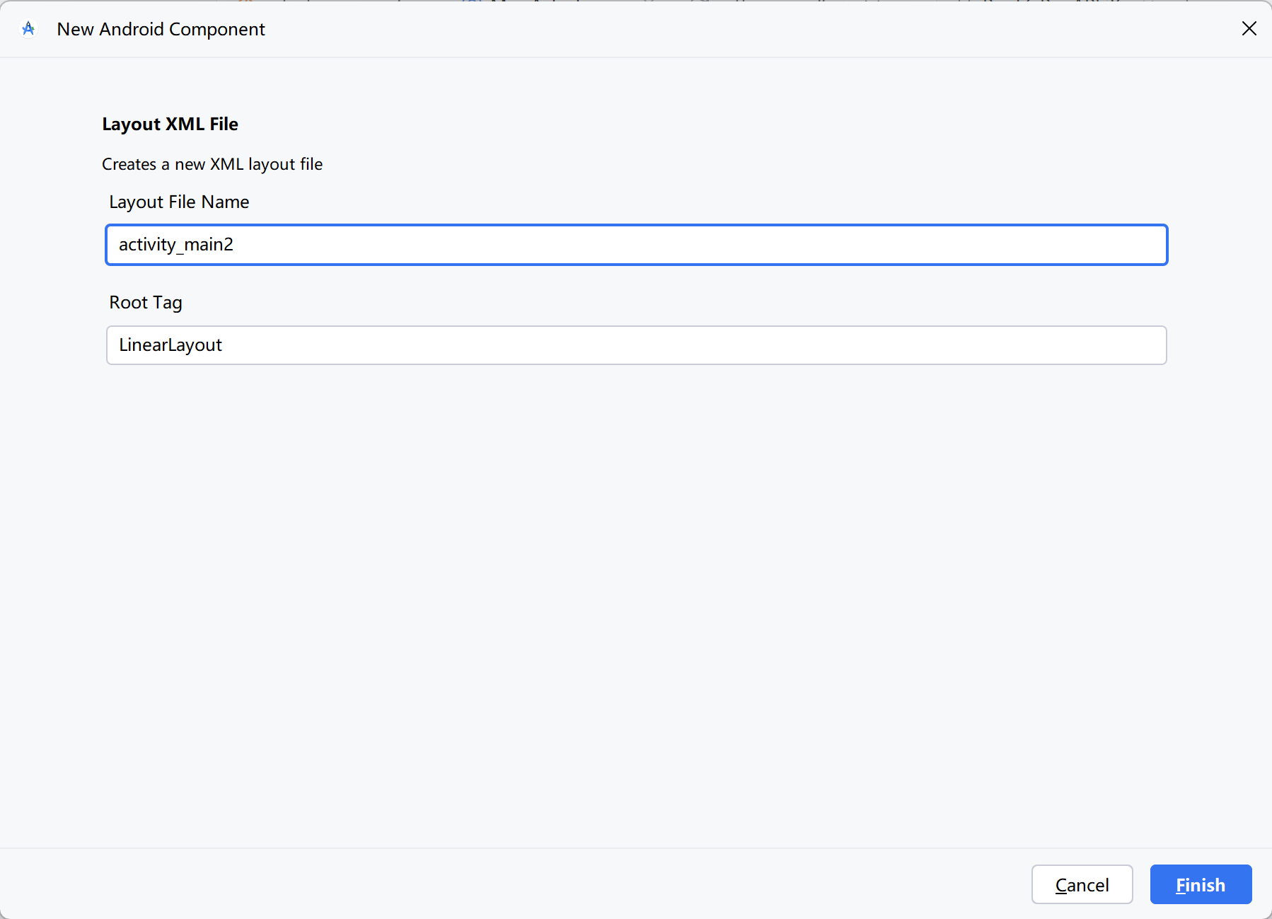 在 XML 创建对话框的 Layout File Name 输入框中填写 XML 文件名,例如 activity_main2,然后单击窗口右下角的 Finish 按钮。之后便会在 layout 目录下面看到新创建的 XML 文件 activity_main2.xml,双击它即可打开该 XML 的编辑窗口,再往其中填写详细的布局内容。