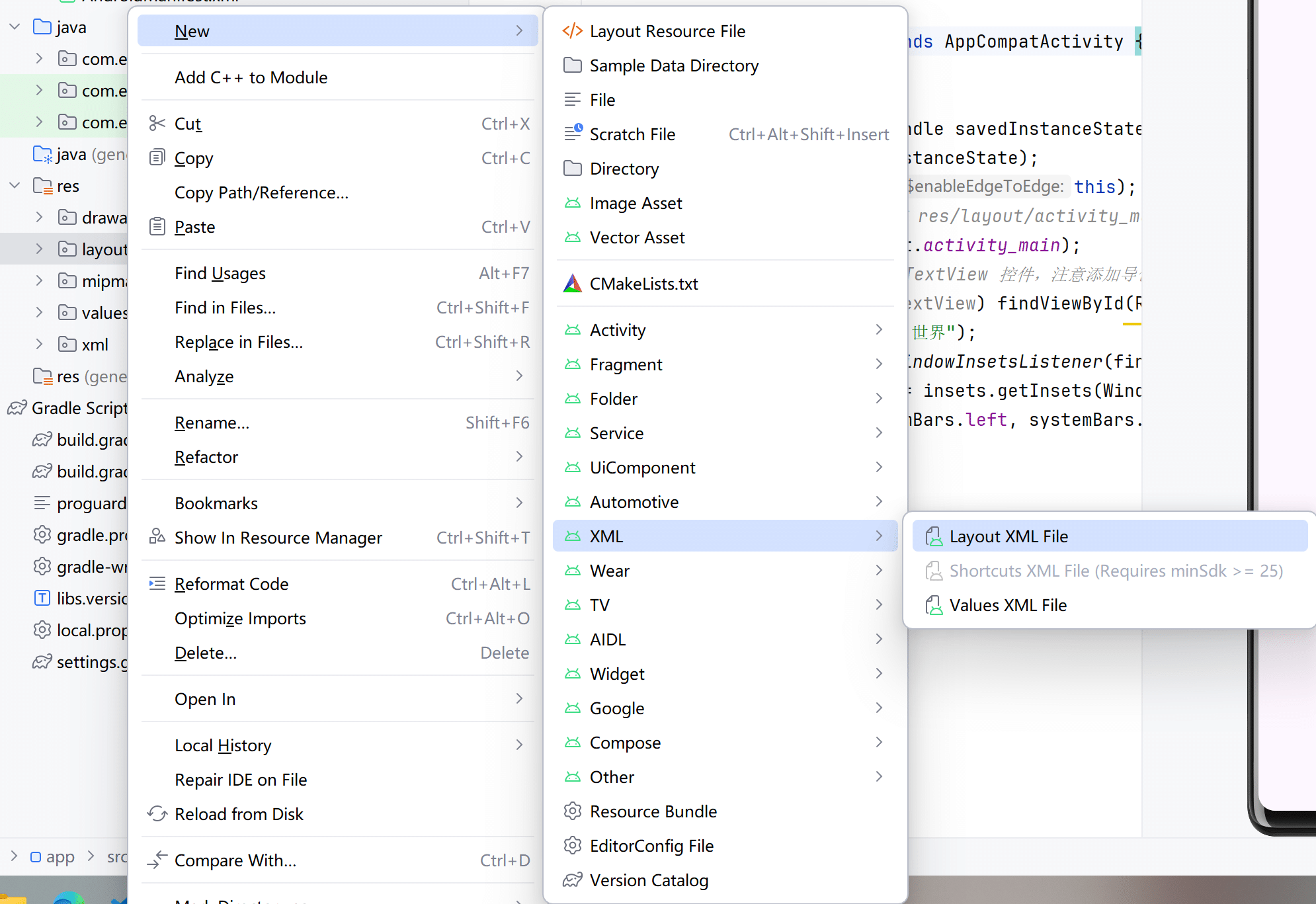 在 Android Studio 左上方找到项目结构图,右击 res 目录下面的 layout,弹出如图 2-20 所示的右键菜单。