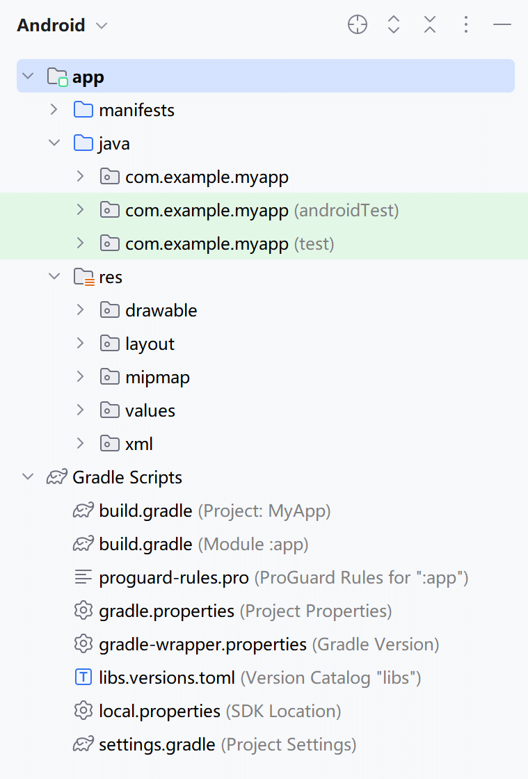 - java 子目录,下面有3个 com.example.myapp 包,其中第一个包存放当前模块的 Java 源代码,后面两个包存放测试用的 Java 代码。