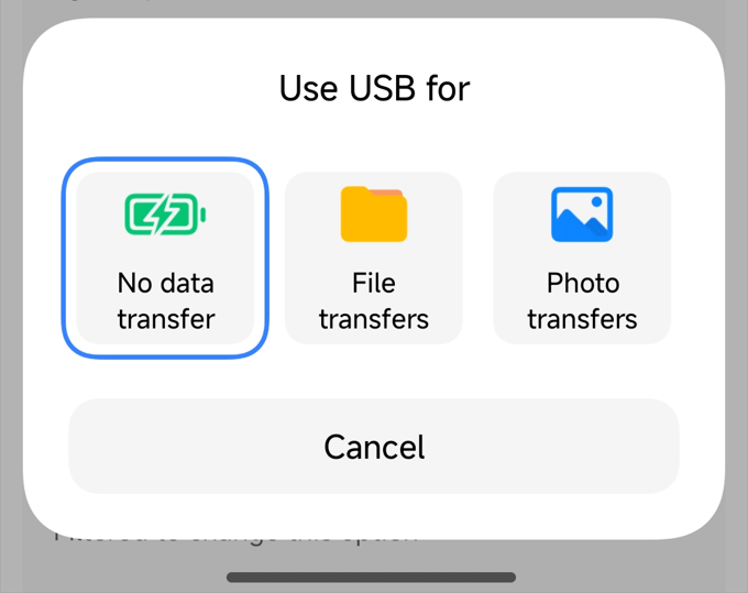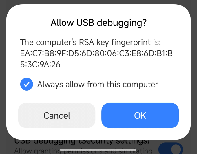 4.将连接的手机设为文件传输模式,并允许计算机进行 USB 调试