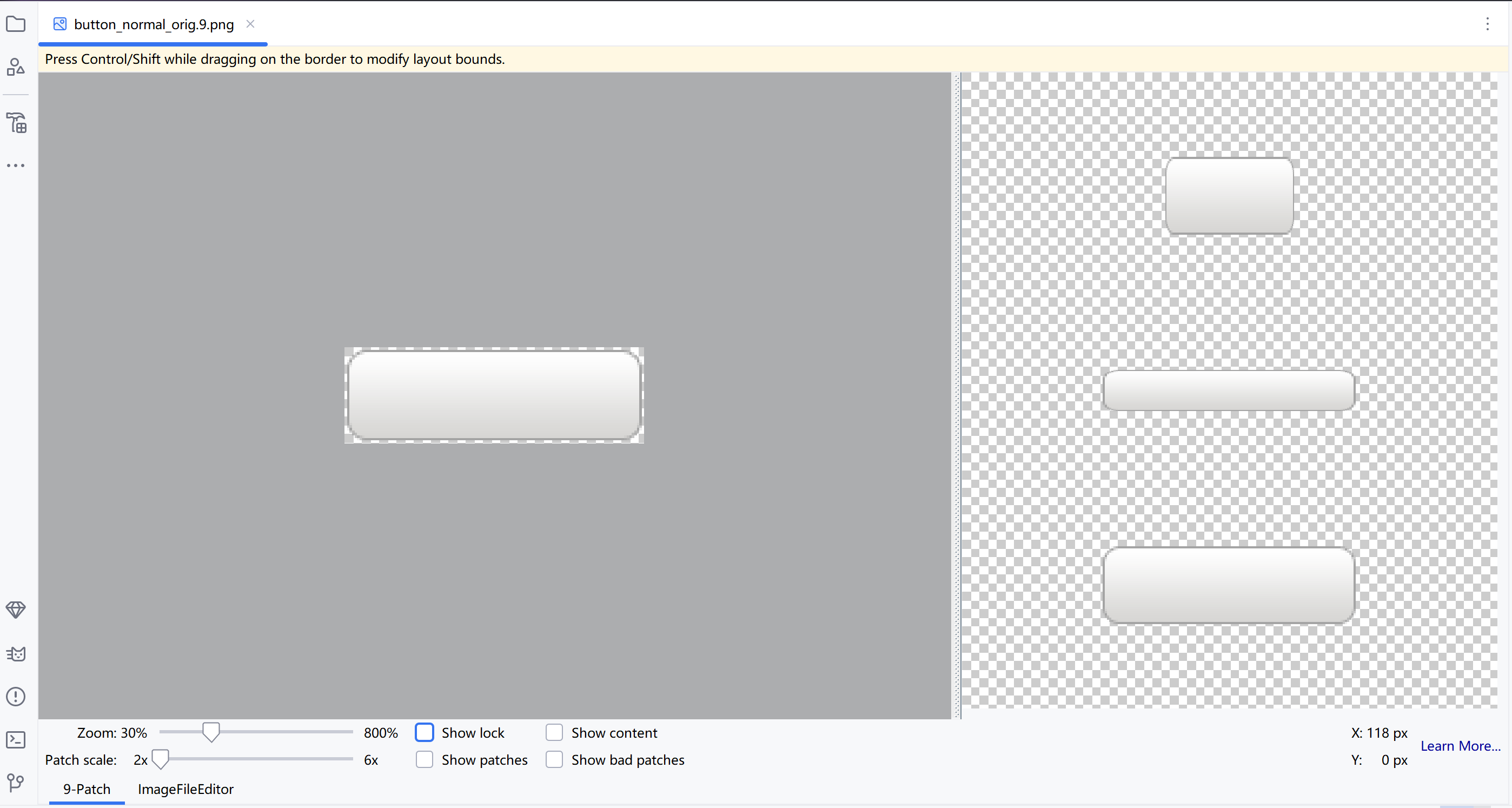 为了解决这个问题,Android 专门设计了点九图片。点九图片的扩展名是 png,文件名后面常带有“.9”字样。因为该图片划分了 3x3 的九宫格区域,所以得名点九图片,也叫九宫格图片。如果背景是一个形状图形,其 stroke 节点的 width 属性已经设置了固定数值(如 1dp),那么无论该图形被拉到多大,描边宽度始终是 1dp。点九图片的实现原理与之类似,即拉伸图形时,只拉伸内部区域,不拉伸边缘线条。