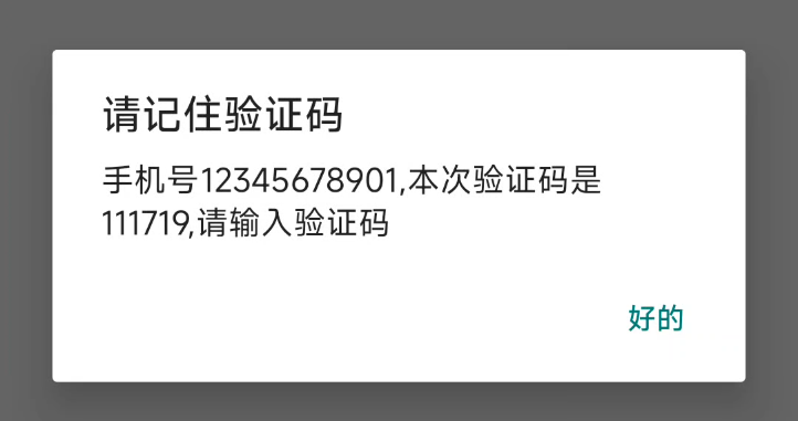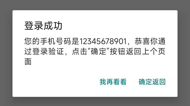 - 提醒对话框 AlertDialog:为了演示方便,获取验证码与登录成功都通过提醒对话框向用户反馈结果。