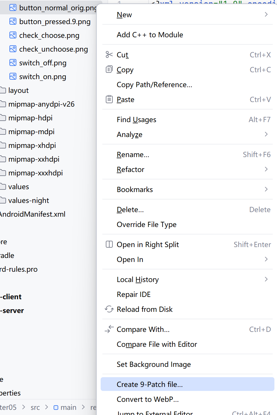 为了掩饰九宫格图片的展示效果,要利用 Android Studio 制作一张点九图片。首先在 drawable 目录下找到代加工的原始图片 button_pressed_orig.png,右击它弹出右键菜单如图 5-4 所示。