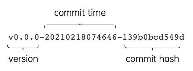 引入某些没有发布过tag版本标识的依赖包时,go.mod中记录的依赖版本信息就会出现类似v0.0.0-20210218074646-139b0bcd549d的格式,由版本号、commit 时间和 commit 的 hash 值组成。