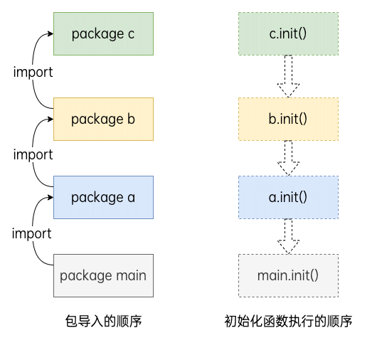 一个包的初始化过程是按照代码中引入的顺序来进行的,所有在该包中声明的init函数都将被串行调用并且仅调用执行一次。每一个包初始化的时候都是先执行依赖的包中声明的init函数再执行当前包中声明的 init 函数。确保在程序的main函数开始执行时所有的依赖包都已初始化完成。