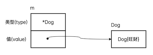m = &Dog{Name: "旺财"}此时,接口值m的动态类型会被设置为*Dog,动态值为结构体变量的拷贝。