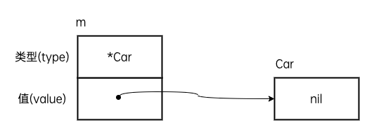 m = c这一次,接口值m的动态类型为*Car,动态值为nil。
