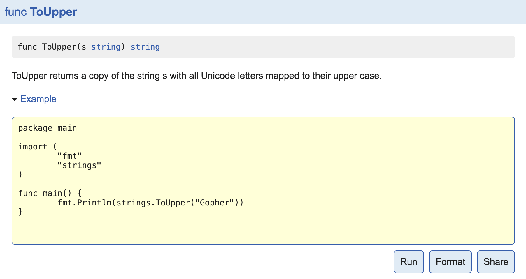 ok moduledemo/split 0.242s- 示例函数提供了可以直接运行的示例代码,可以直接在 golang.org 的 godoc 文档服务器上使用 Go Playground 运行示例代码。下图为 strings.ToUpper 函数在 Playground 的示例函数效果。