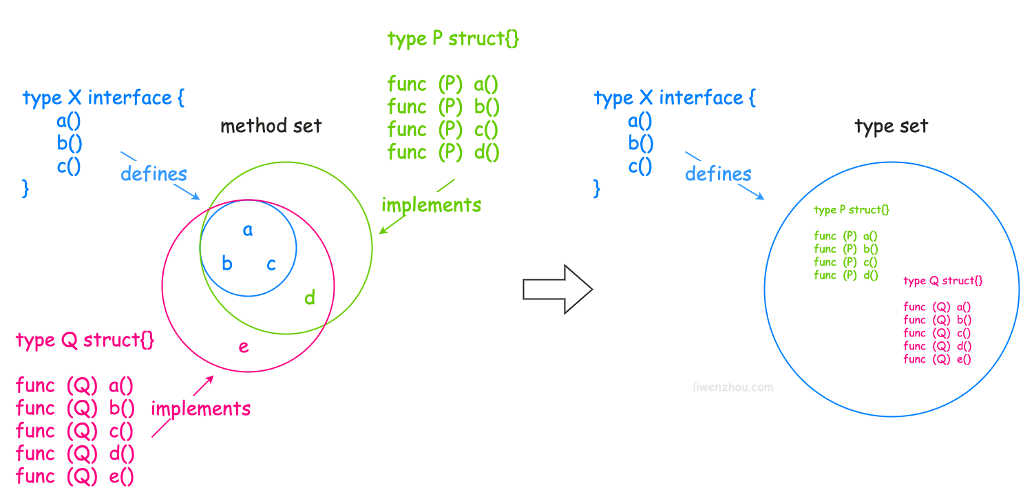 把接口类型当做类型集相较于方法集有一个优势: 我们可以显式地向集合添加类型,从而以新的方式控制类型集。