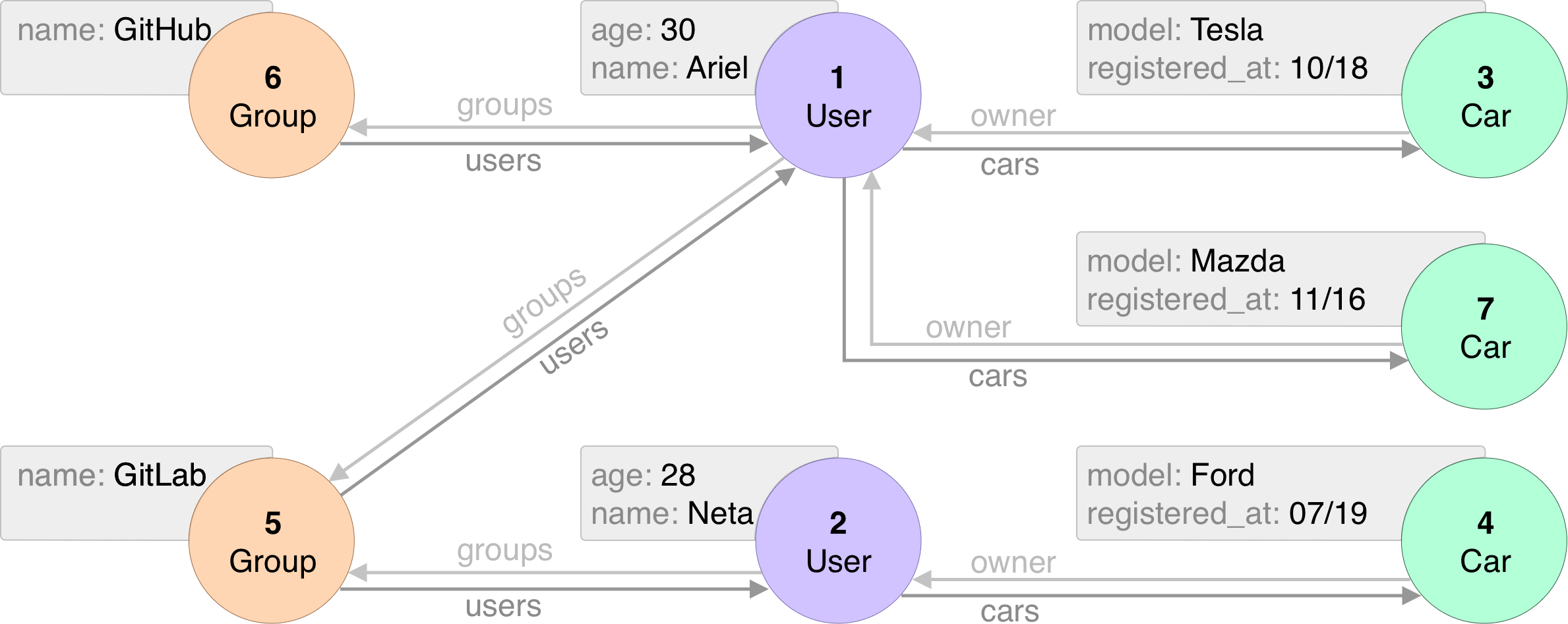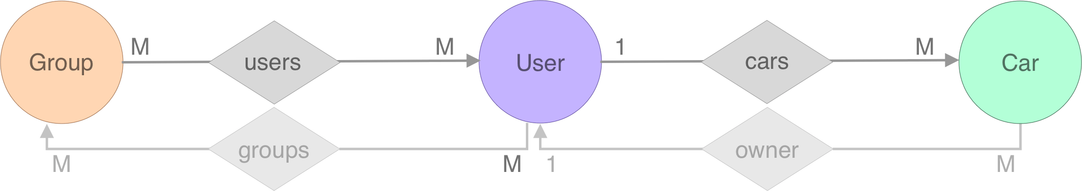 每个 Group 实体可以有多个 User,并且一个 User 可以连接到多个 Group;这是一个简单的“多对多”关系。在上图中,Group 模式是用户边(关系)的所有者,User 实体对这个名为 Group 的关系具有反向引用/反向边。让我们在 schema 中定义这种关系: