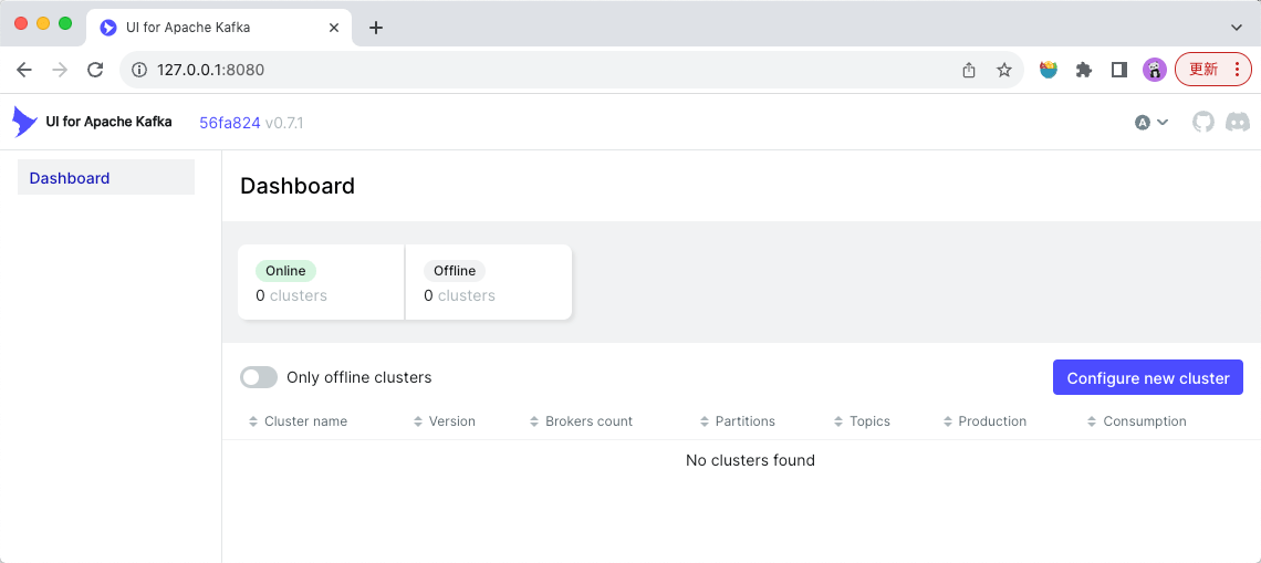 容器启动后,使用浏览器打开127.0.0.1:8080即可看到如下kafka-ui界面。