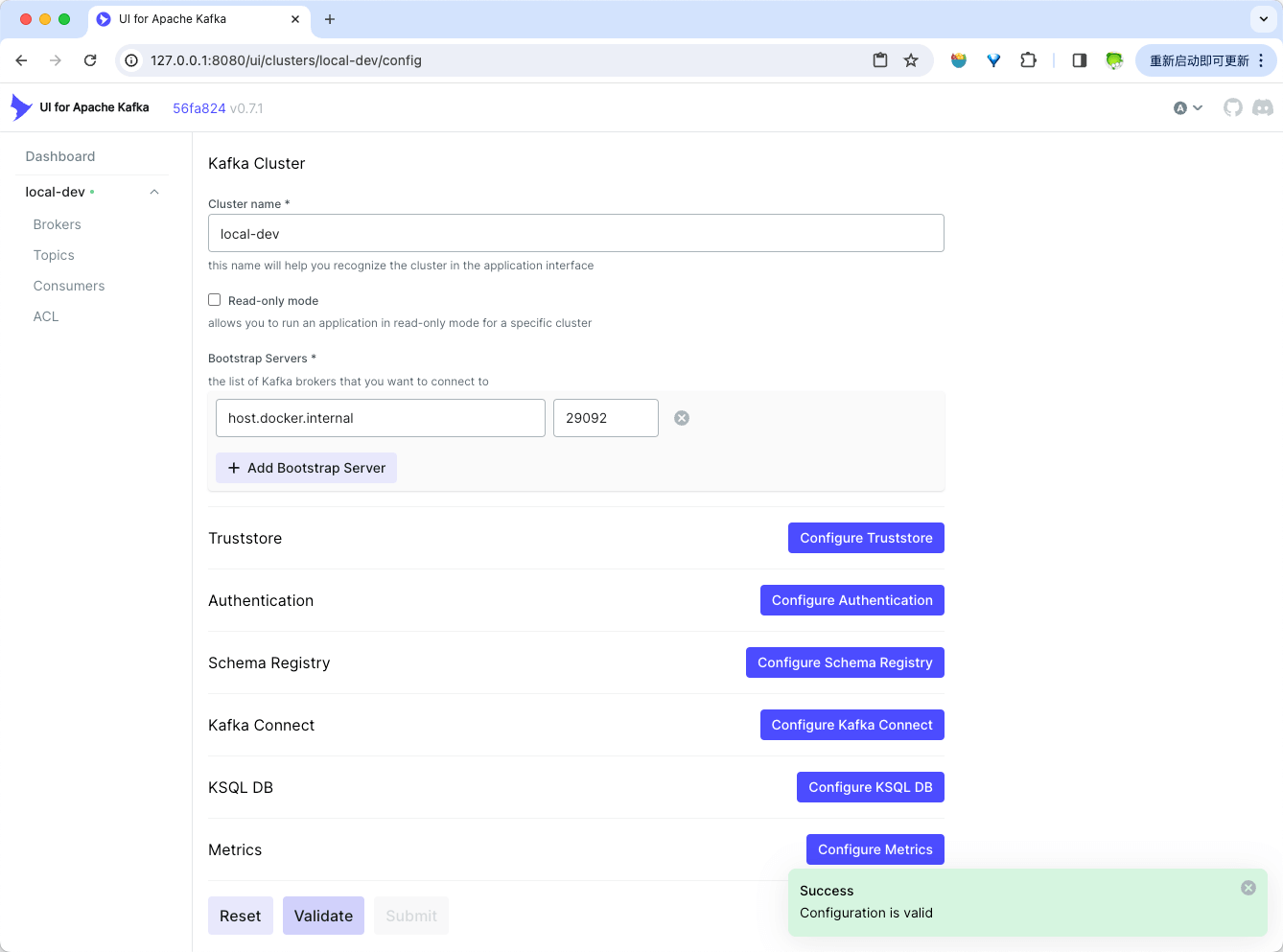 点击页面右侧的"Configure new cluster"按钮,配置 kafka 服务连接信息。
