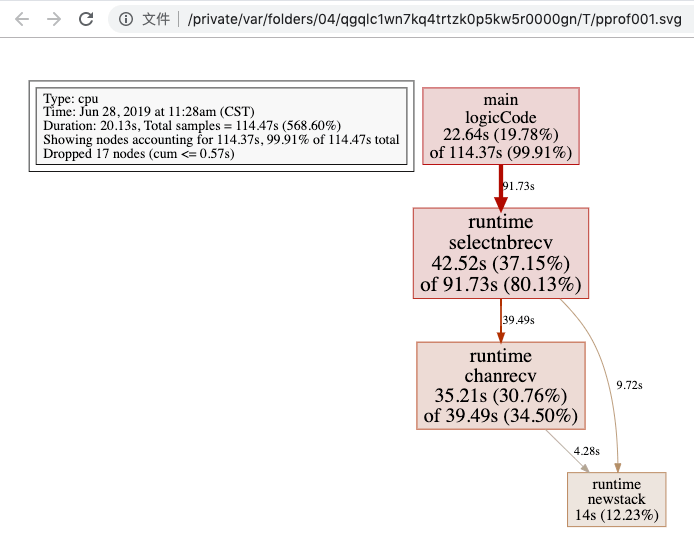 35.21s 30.76% 67.90% 39.49s 34.50% runtime.chanrecv