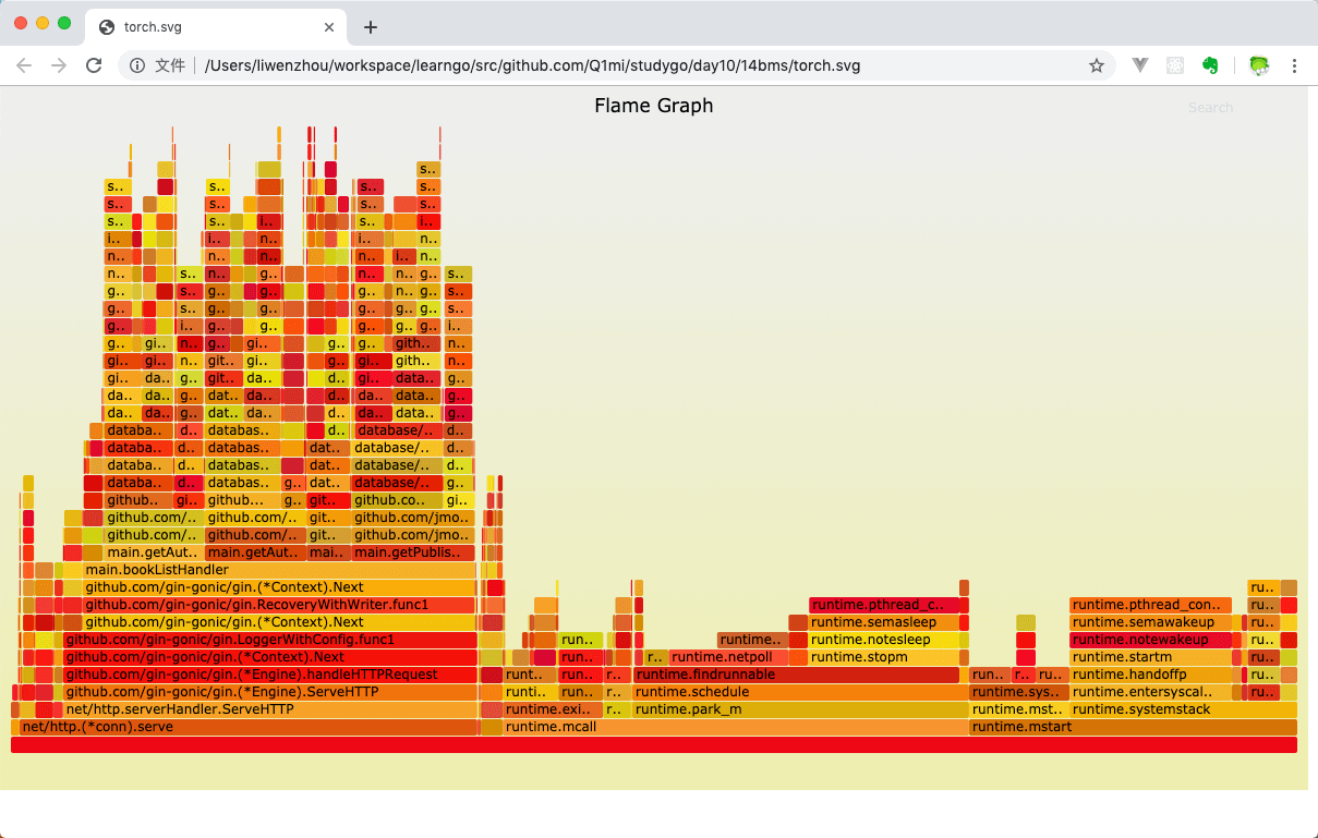 go get -v github.com/uber/go-torch火焰图 svg 文件可以通过浏览器打开,它对于调用图的最优点是它是动态的:可以通过点击每个方块来 zoom in 分析它上面的内容。