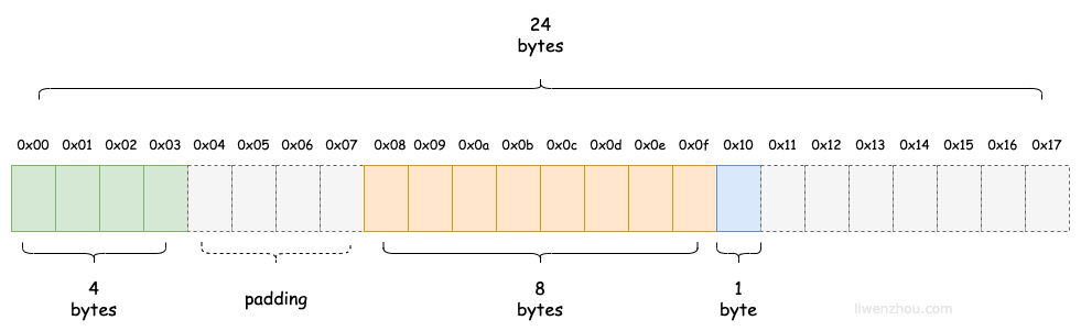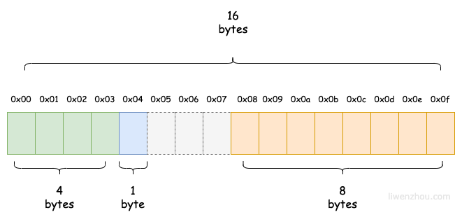 很显然结构体变量b1的内存布局和上图中的并不一致,实际上的布局应该如下图所示,灰色虚线的部分就是内存对齐时的填充(padding)部分。