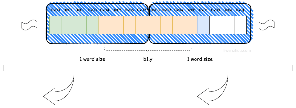 Go 在编译的时候会按照一定的规则自动进行内存对齐。之所以这么设计是为了减少 CPU 访问内存的次数,加大 CPU 访问内存的吞吐量。如果不进行内存对齐的话,很可能就会增加 CPU 访问内存的次数。例如下图中 CPU 想要获取b1.y字段的值可能就需要两次总线周期。
