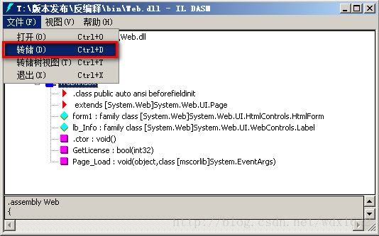 把dll文件转储为*.il文件存到某个指定文件夹里,如我们起名为:Web.il和Web.res两个文件,有时也会有*.resource文件
