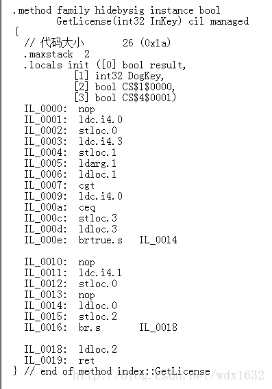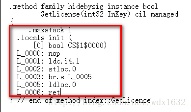 步骤四:修改GetLicense()方法内的IL代码,让它固定返回true;下面这个IL就是让它返回为true;修改完接着保存IL文件。就是用下面的代码替换下面图片中的代码。