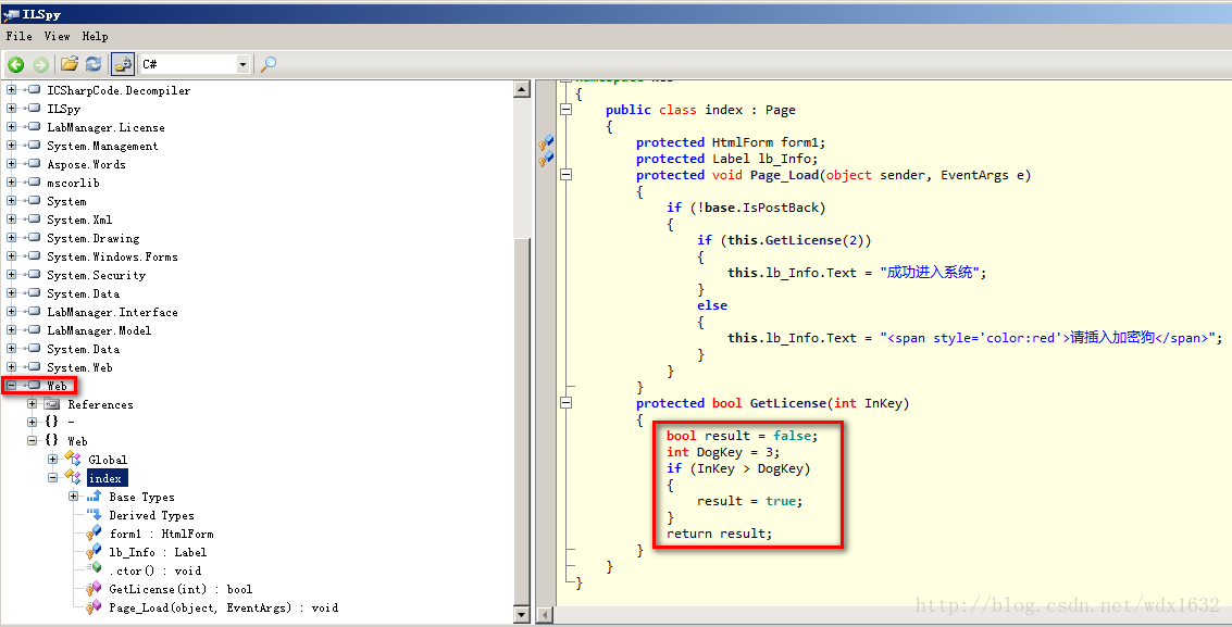 从上面反编译出来的源代码不难发现重点是在GetLicense()方法,这个也是我们要修改的内容,从上面可以看出在没有修改前这个都是会提示要插入加密狗的;