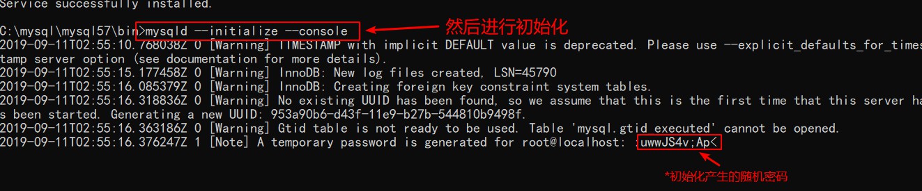 ③初始化mysql,在这里,初始化会产生一个随机密码,如下图框框所示,记住这个密码,后面会用到(mysqld --initialize --console)