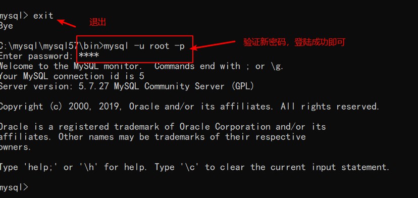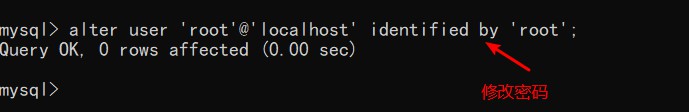 **⑥修改密码:**alter user 'root'@'localhost' identified by 'root';(by 接着的是密码)