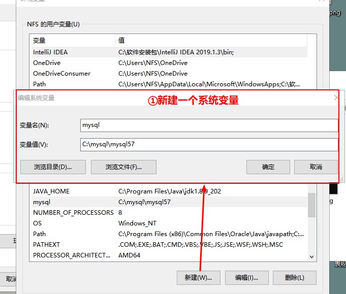 ②把新建的mysql变量添加到Path路径变量中,点击确定,即完成: